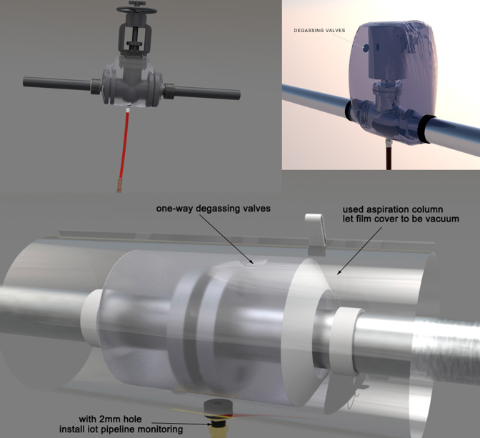 美國(guó)或日本公司有采用密封袋可以將法蘭完全包裹起來(lái), 其成分是由低滲透性聚合物、 緩蝕 劑蒸汽和干燥劑組成。它安裝便捷,但是袋子的兩端僅用膠帶密封, 而不是采用持久有效的機(jī)械粘結(jié)。袋子內(nèi)部存在大面積的蒸汽空間, 容易聚集大量的水分,緩蝕劑也會(huì)在一段時(shí)間內(nèi)被消耗掉。